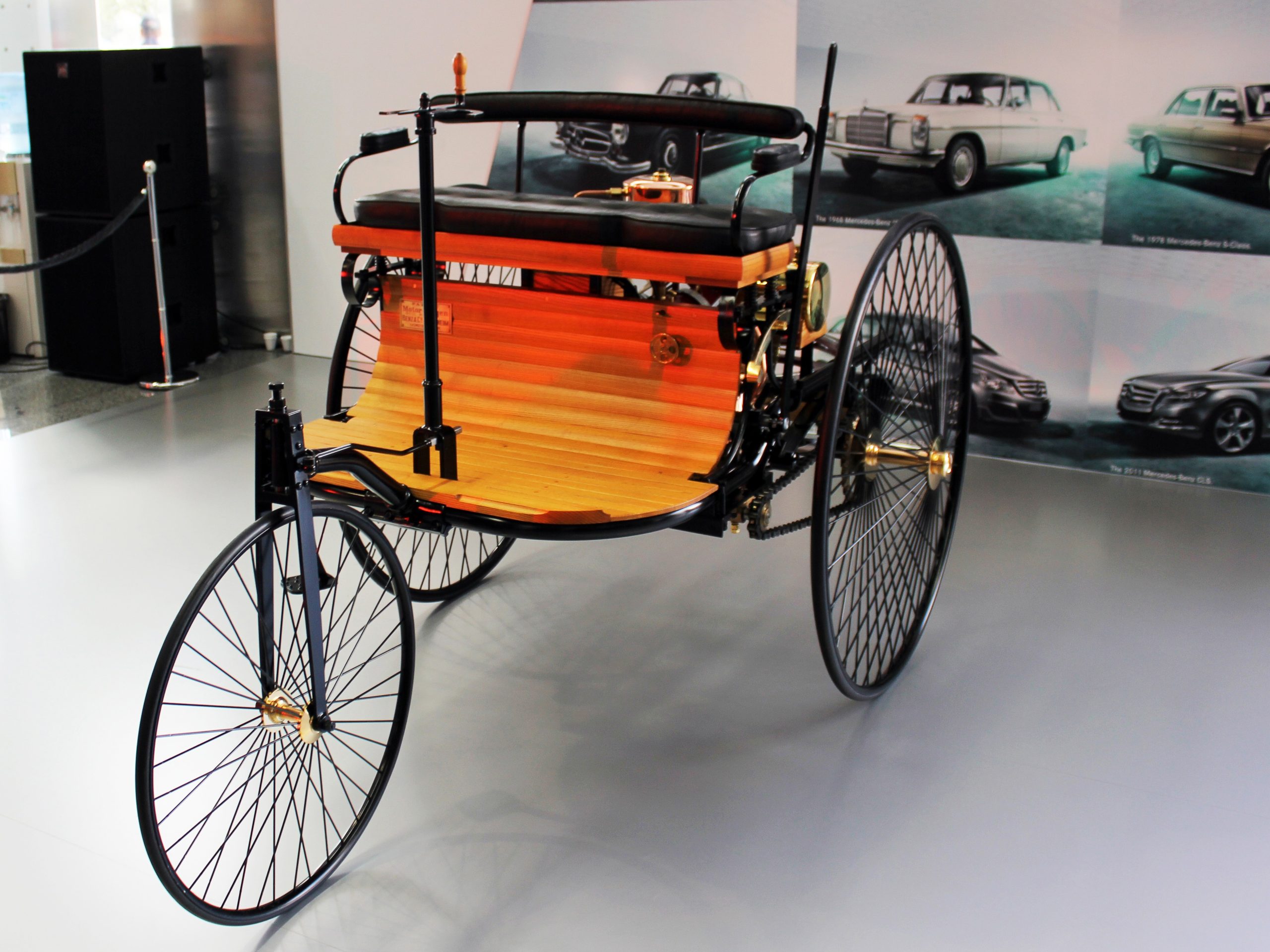 Carl Benz wasn’t a fan of the traditional four-wheel design available at the time. Instead, he opted for a three-wheel setup with power delivered to the two rear wheels and a single front wheel for steering. This unique design featured a simple drive system with chain drives and a single-speed transmission operated by a big leather strap. Benz even placed the flywheel horizontally to minimize steering difficulty due to inertia.